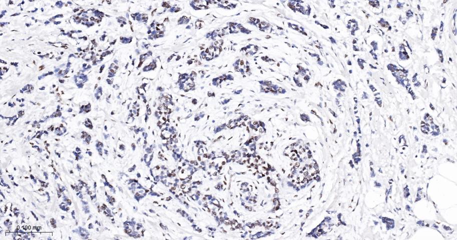 Paraformaldehyde-fixed, paraffin embedded Human Breast Cancer; Antigen retrieval by boiling in sodium citrate buffer (pH6.0) for 15 min; The section was incubated with Ki-67 Monoclonal Antibody, Unconjugated (bsm-25816M) at 1:1000 overnight at 4°C, followed by conjugation to the bs-40296G-HRP and DAB (C-0010) staining.