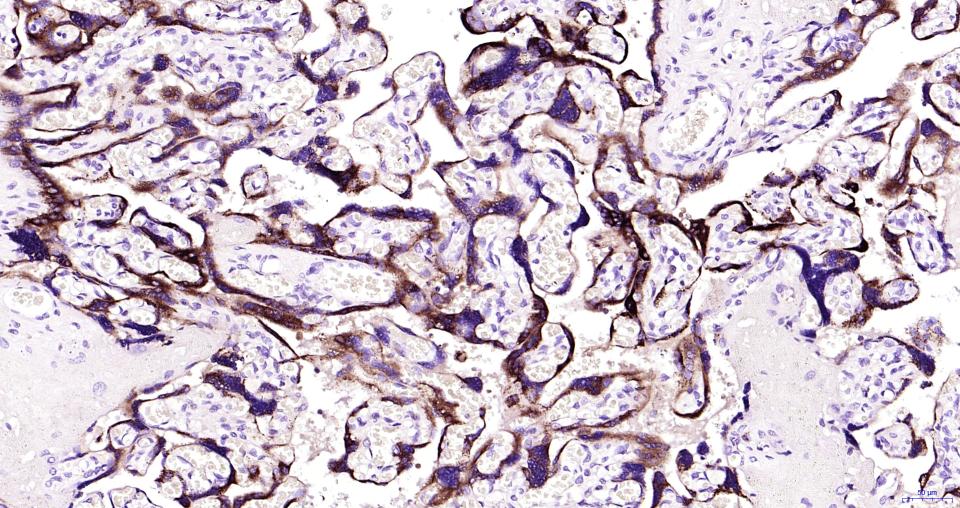 Paraformaldehyde-fixed, paraffin embedded Human placenta; Antigen retrieval by boiling in sodium citrate buffer (pH6.0) for 15 min; Antibody incubation with Human CG beta Monoclonal Antibody, Unconjugated(bsm-43172M) at 1:200 overnight at 4°C, followed by conjugation to the bs-40296G-HRP and DAB (C-0010) staining.