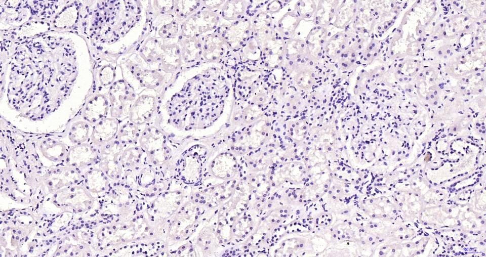 (Negative control) Paraformaldehyde-fixed, paraffin embedded Human kidney; Antigen retrieval by boiling in sodium citrate buffer (pH6.0) for 15 min; Antibody incubation with Human CG beta Monoclonal Antibody, Unconjugated(bsm-43172M) at 1:200 overnight at 4°C, followed by conjugation to the bs-40296G-HRP and DAB (C-0010) staining