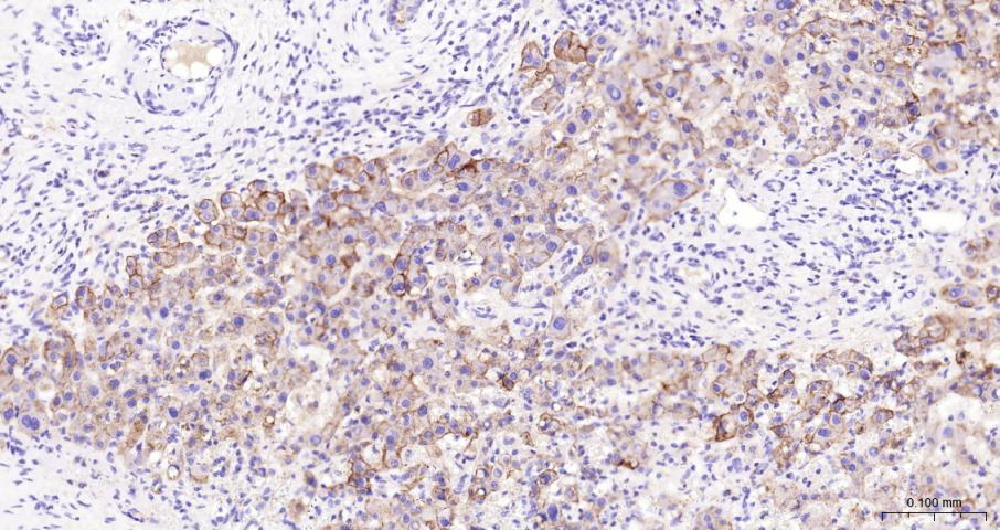 Paraformaldehyde-fixed, paraffin embedded Human Liver Cancer; Antigen retrieval by boiling in sodium citrate buffer (pH6.0) for 15 min; The section was incubated with Syndecan-1 Monoclonal Antibody, Unconjugated (bsm-43670M) at 1:200 overnight at 4°C, followed by conjugation to the bs-40296G-HRP and DAB (C-0010) staining.