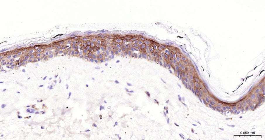 Paraformaldehyde-fixed, paraffin embedded Human Skin; Antigen retrieval by boiling in sodium citrate buffer (pH6.0) for 15 min; The section was incubated with Syndecan-1 Monoclonal Antibody, Unconjugated (bsm-43670M) at 1:200 overnight at 4°C, followed by conjugation to the bs-40296G-HRP and DAB (C-0010) staining.