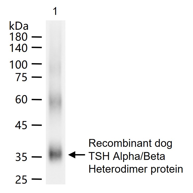 100 ng Recombinant dog TSH Alpha/Beta Heterodimer protein, C-His (HEK293) (bs-43168P) per lane probed with Dog TSH-alpha/Beta Heterodimer monoclonal antibody respectively, unconjugated (bsm-43168M) at 1:1000 dilution and 4°C overnight incubation. Followed by corresponding conjugated secondary antibody incubation at r.t. for 60 min.