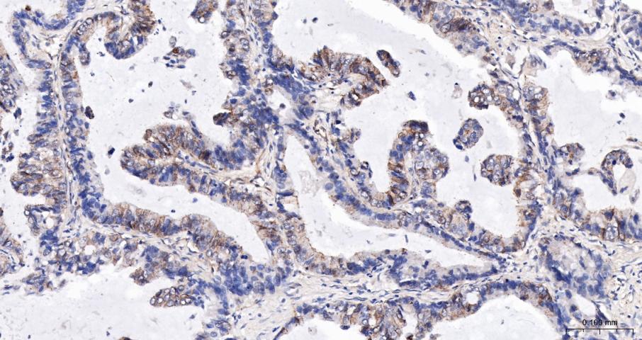 Paraformaldehyde-fixed, paraffin embedded Human Lung Cancer; Antigen retrieval by boiling in sodium citrate buffer (pH6.0) for 15 min; The section was incubated with Cadherin-1 Polyclonal Antibody, Unconjugated (bs-42419R) at 1:200 overnight at 4°C, followed by conjugation to the bs-0295G-HRP and DAB (C-0010) staining.