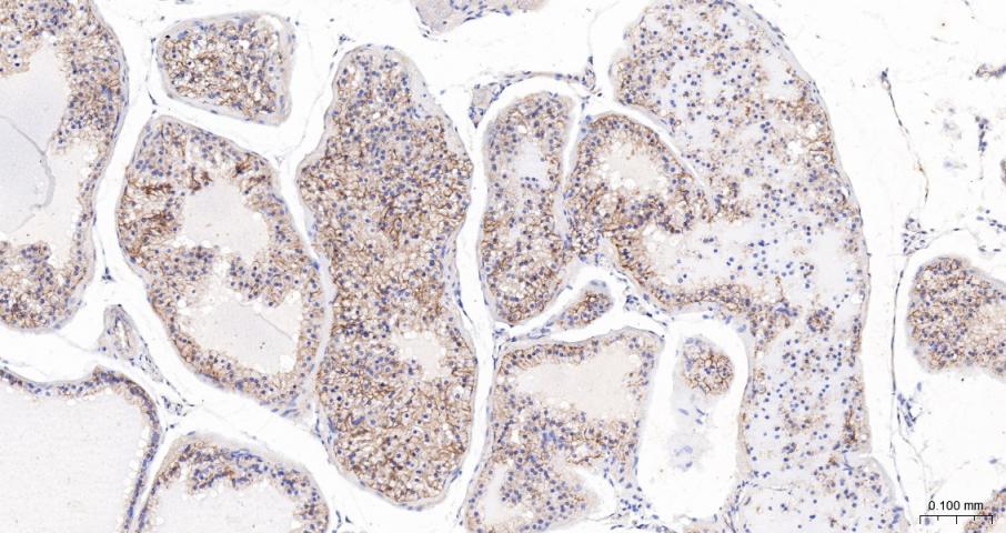 Paraformaldehyde-fixed, paraffin embedded Mouse Prostate; Antigen retrieval by boiling in sodium citrate buffer (pH6.0) for 15 min; The section was incubated with Cadherin-1 Polyclonal Antibody, Unconjugated (bs-42419R) at 1:200 overnight at 4°C, followed by conjugation to the bs-0295G-HRP and DAB (C-0010) staining.