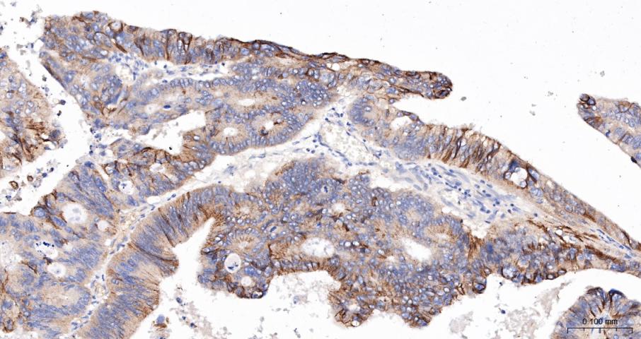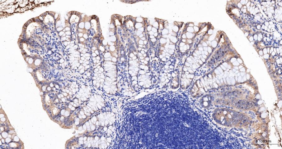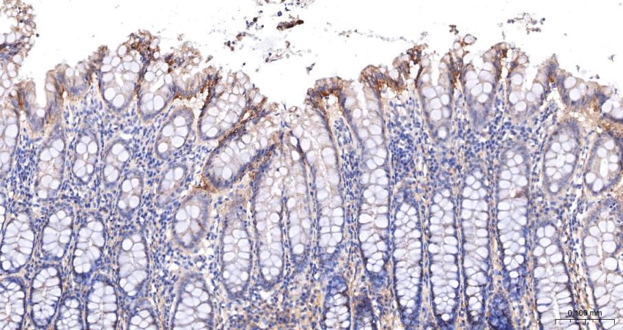Paraformaldehyde-fixed, paraffin embedded Mouse Colon; Antigen retrieval by boiling in sodium citrate buffer (pH6.0) for 15 min; The section was incubated with Cadherin-1 Polyclonal Antibody, Unconjugated (bs-42419R) at 1:200 overnight at 4°C, followed by conjugation to the bs-0295G-HRP and DAB (C-0010) staining.