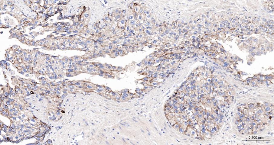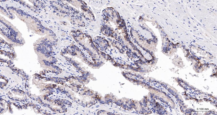 Paraformaldehyde-fixed, paraffin embedded Human Prostate Tumor; Antigen retrieval by boiling in sodium citrate buffer (pH6.0) for 15 min; The section was incubated with Cadherin-1 Polyclonal Antibody, Unconjugated (bs-42419R) at 1:200 overnight at 4°C, followed by conjugation to the bs-0295G-HRP and DAB (C-0010) staining.