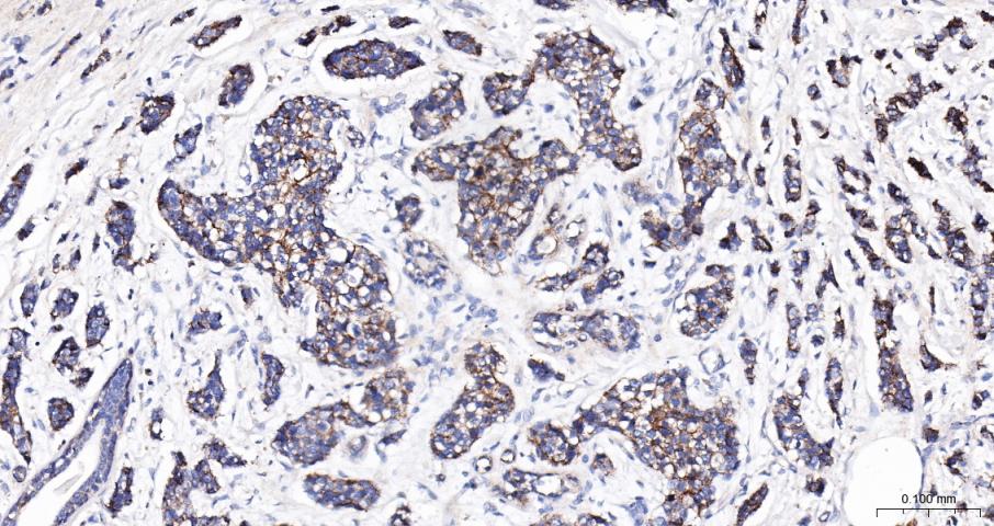 Paraformaldehyde-fixed, paraffin embedded Human Breast Cancer; Antigen retrieval by boiling in sodium citrate buffer (pH6.0) for 15 min; The section was incubated with Cadherin-1 Polyclonal Antibody, Unconjugated (bs-42419R) at 1:200 overnight at 4°C, followed by conjugation to the bs-0295G-HRP and DAB (C-0010) staining.