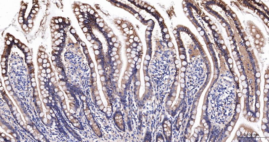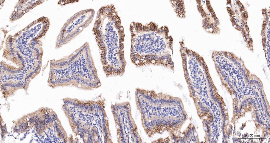 Paraformaldehyde-fixed, paraffin embedded Mouse Small Intestine; Antigen retrieval by boiling in sodium citrate buffer (pH6.0) for 15 min; The section was incubated with Cadherin-1 Polyclonal Antibody, Unconjugated (bs-42419R) at 1:200 overnight at 4°C, followed by conjugation to the bs-0295G-HRP and DAB (C-0010) staining.