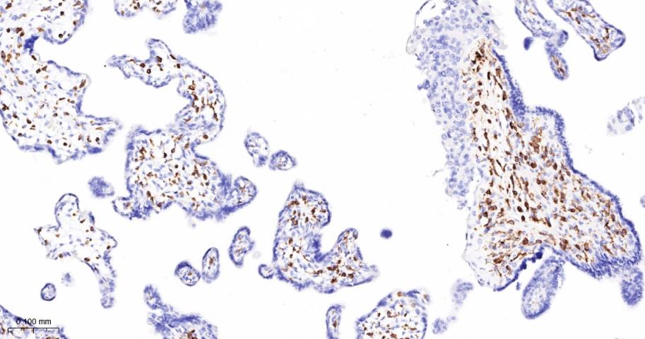 Paraformaldehyde-fixed, paraffin embedded Human Placenta; Antigen retrieval by boiling in sodium citrate buffer (pH6.0) for 15 min; The section was incubated with CD163 Monoclonal Antibody, Unconjugated (bsm-43679M) at 1:200 overnight at 4°C, followed by conjugation to the bs-40296G-HRP and DAB (C-0010) staining.