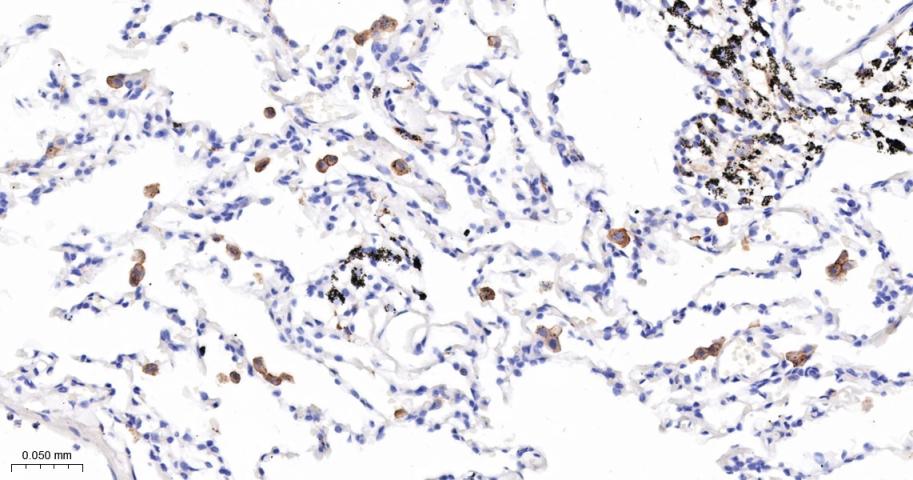 Paraformaldehyde-fixed, paraffin embedded Human Lung; Antigen retrieval by boiling in sodium citrate buffer (pH6.0) for 15 min; The section was incubated with CD163 Monoclonal Antibody, Unconjugated (bsm-43679M) at 1:200 overnight at 4°C, followed by conjugation to the bs-40296G-HRP and DAB (C-0010) staining.
