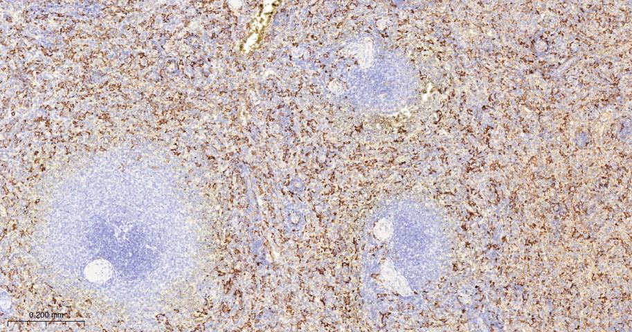 Paraformaldehyde-fixed, paraffin embedded Human Spleen; Antigen retrieval by boiling in sodium citrate buffer (pH6.0) for 15 min; The section was incubated with CD163 Monoclonal Antibody, Unconjugated (bsm-43679M) at 1:200 overnight at 4°C, followed by conjugation to the bs-40296G-HRP and DAB (C-0010) staining.