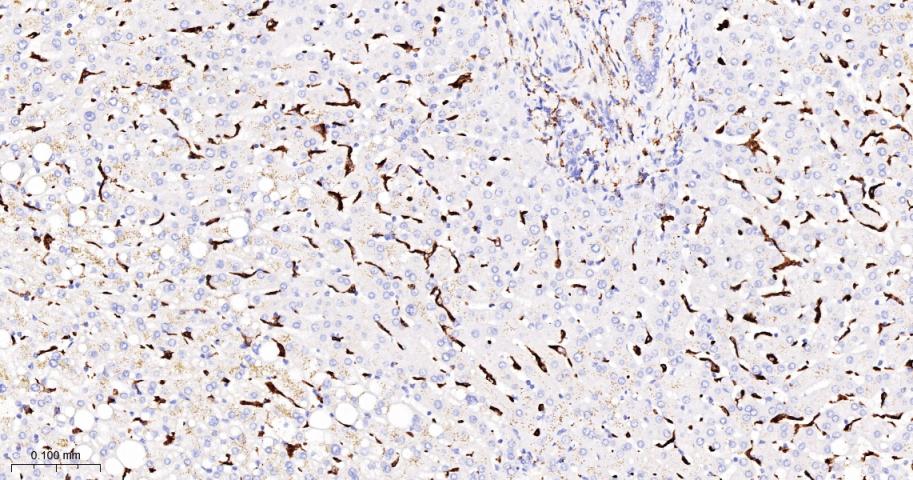 Paraformaldehyde-fixed, paraffin embedded Human Liver; Antigen retrieval by boiling in sodium citrate buffer (pH6.0) for 15 min; The section was incubated with CD163 Monoclonal Antibody, Unconjugated (bsm-43679M) at 1:200 overnight at 4°C, followed by conjugation to the bs-40296G-HRP and DAB (C-0010) staining.