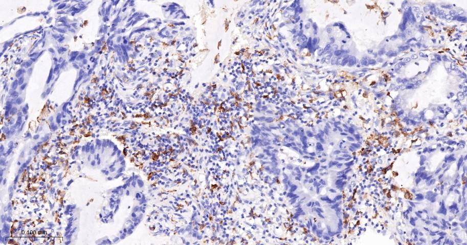 Paraformaldehyde-fixed, paraffin embedded Human Colon Cancer; Antigen retrieval by boiling in sodium citrate buffer (pH6.0) for 15 min; The section was incubated with CD163 Monoclonal Antibody, Unconjugated (bsm-43679M) at 1:200 overnight at 4°C, followed by conjugation to the bs-40296G-HRP and DAB (C-0010) staining.