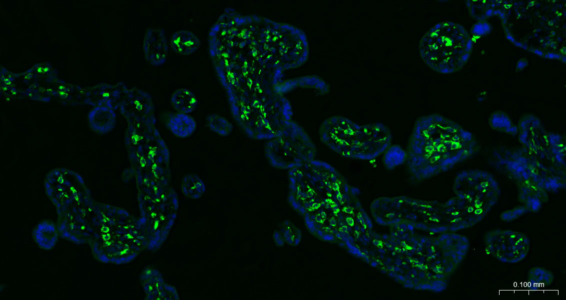 Paraformaldehyde-fixed, paraffin embedded Human Placenta; Antigen retrieval by boiling in sodium citrate buffer (pH6.0) for 15 min; The section was incubated with CD163 Monoclonal Antibody, Unconjugated (bsm-43679M) at 1:200 overnight at 4°C. Followed by conjugated Goat Anti-Mouse IgG antibody (green, bs-0296G-BF488), DAPI (blue, C02-04002) was used to stain the cell nuclei.