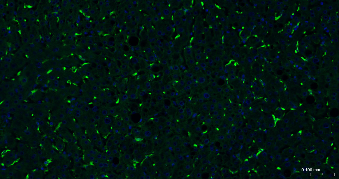 Paraformaldehyde-fixed, paraffin embedded Human Liver; Antigen retrieval by boiling in sodium citrate buffer (pH6.0) for 15 min; The section was incubated with CD163 Monoclonal Antibody, Unconjugated (bsm-43679M) at 1:200 overnight at 4°C. Followed by conjugated Goat Anti-Mouse IgG antibody (green, bs-0296G-BF488), DAPI (blue, C02-04002) was used to stain the cell nuclei.