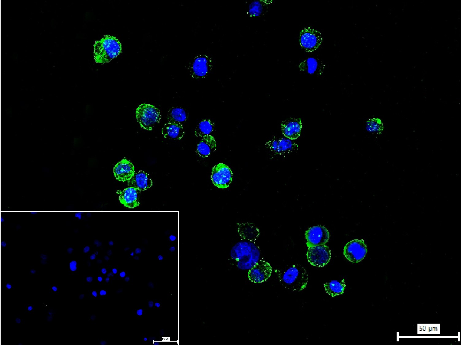 4% Paraformaldehyde-fixed Raji (H) cell; Antibody incubation with (CD86) polyclonal Antibody, unconjugated (bs-25849R) 1:100, 90 min at 37°C; followed by conjugated Goat Anti-Rabbit IgG antibody (green, bs-60295G-BF488) at 37°C for 90 min, DAPI (blue, C02-04002) was used to stain the cell nuclei. PBS instead of the primary antibody was used as the blank control.