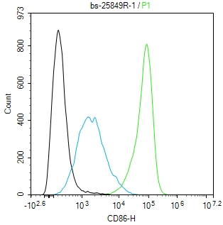 The Raji (H) cells were incubated in 5%BSA to block non-specific protein-protein interactions (30 min at r.t.). Primary Antibody (green): Rabbit Anti-CD86 antibody (bs-25849R): 1 μg/10^6 cells; Secondary Antibody (white blue): Goat anti-Rabbit IgG-BF488 (bs-60295G-BF488): 1 μg/test. Isotype Control (orange): Rabbit IgG (bs-0295P). Blank control (black): PBS. Acquisition of 20,000 events was performed.