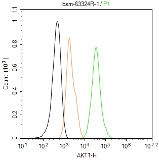 The HeLa (H) cells were fixed with 4% PFA (10 min at r.t.) and then permeabilized with 90% ice-cold methanol for 20 min at -20℃,the cells then were incubated in 5%BSA to block non-specific protein-protein interactions (30 min at r.t.).Primary Antibody (green):Rabbit Anti-AKT antibody (bsm-63324R,1:100); Isotype Control (orange): Rabbit IgG (bs-0295P). Blank control (black): PBS. Acquisition of 20,000 events was performed.