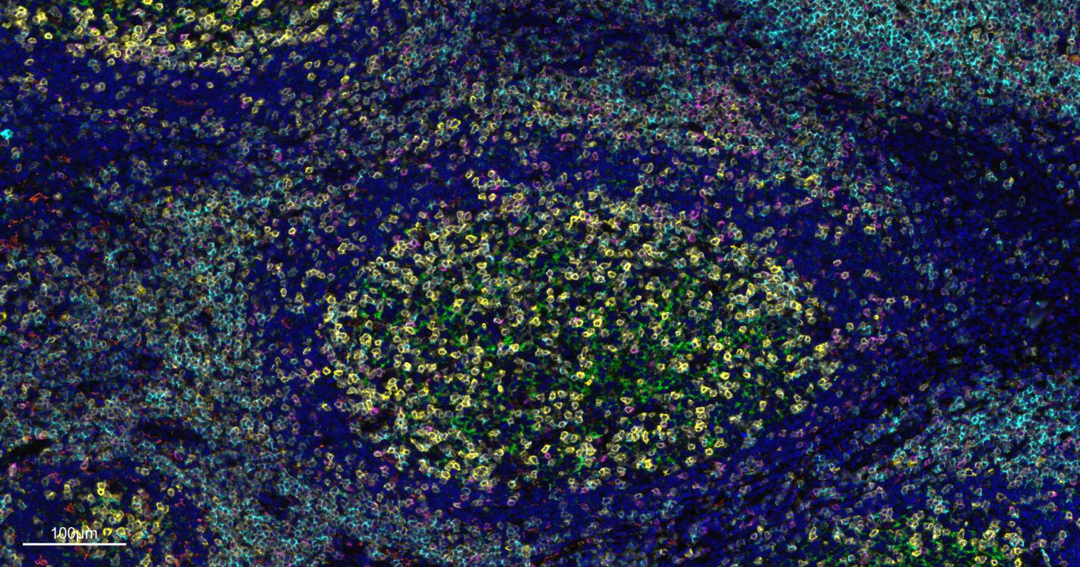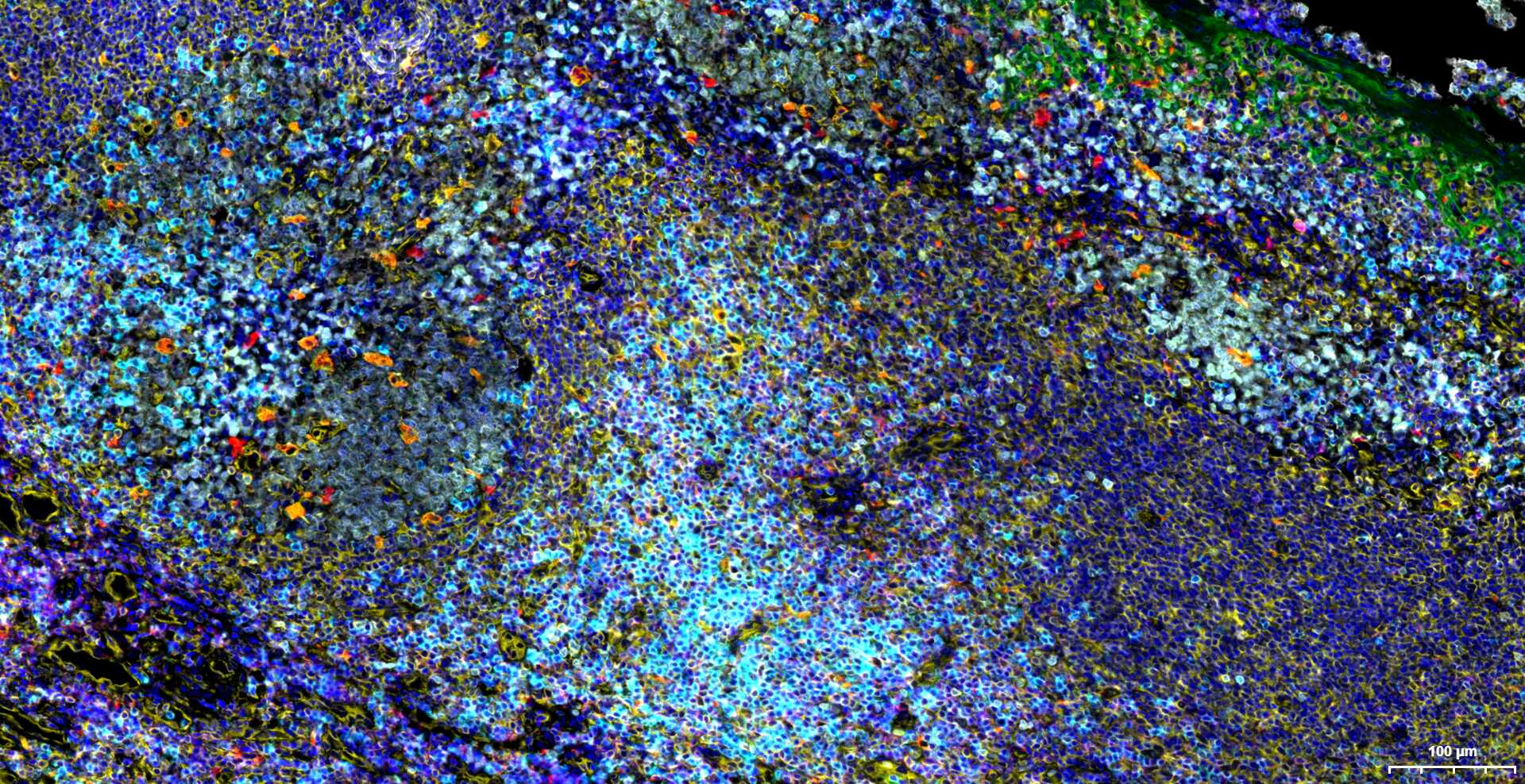 Merged staining of anti-CD8A (bsm-34251M; 1:200; pink) anti-CD4 (bsm-52469R; 1:200; light blue) anti-CD3E (bsm-60002R; 1:200; green) anti-CD68 (bsm-60634R; 1:200; white) anti-CD11c (bsm-61135R; 1:200; orange) and anti-CD20 (bsm-63327R; 1:200; yellow)
