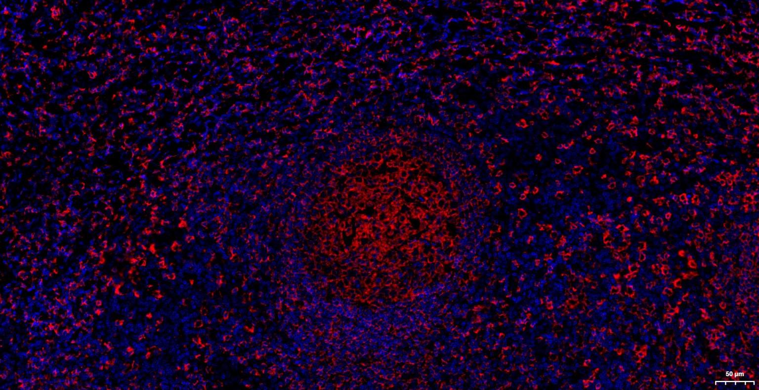 Paraformaldehyde-fixed, paraffin embedded Human Tonsil; Antigen retrieval by boiling in sodium citrate buffer (pH6.0) for 15 min; The section was incubated with CD20 Monoclonal Antibody, Unconjugated (bsm-63327R) at 1:200 overnight at 4°C. Followed by conjugated Goat Anti-Rabbit IgG antibody (Red, bs-0295G-BF594), DAPI (blue, C02-04002) was used to stain the cell nuclei.