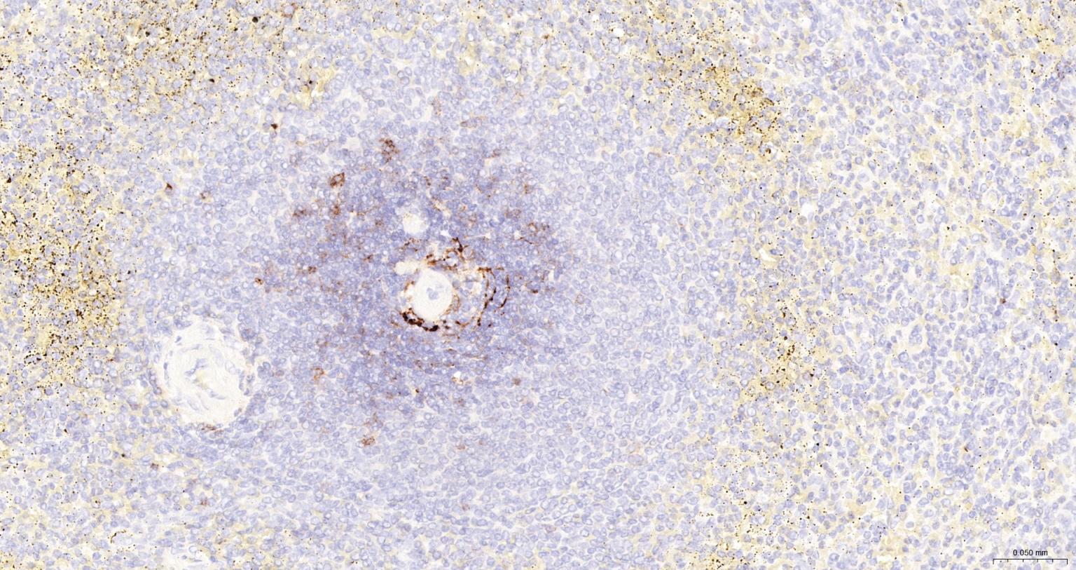 Paraformaldehyde-fixed, paraffin embedded Human Spleen; Antigen retrieval by boiling in sodium citrate buffer (pH6.0) for 15 min; The section was incubated with FCER2/CD23 Monoclonal Antibody, Unconjugated (bsm-43216M) at 1:200 overnight at 4°C, followed by conjugation to the bs-40296G-HRP and DAB (C-0010) staining.