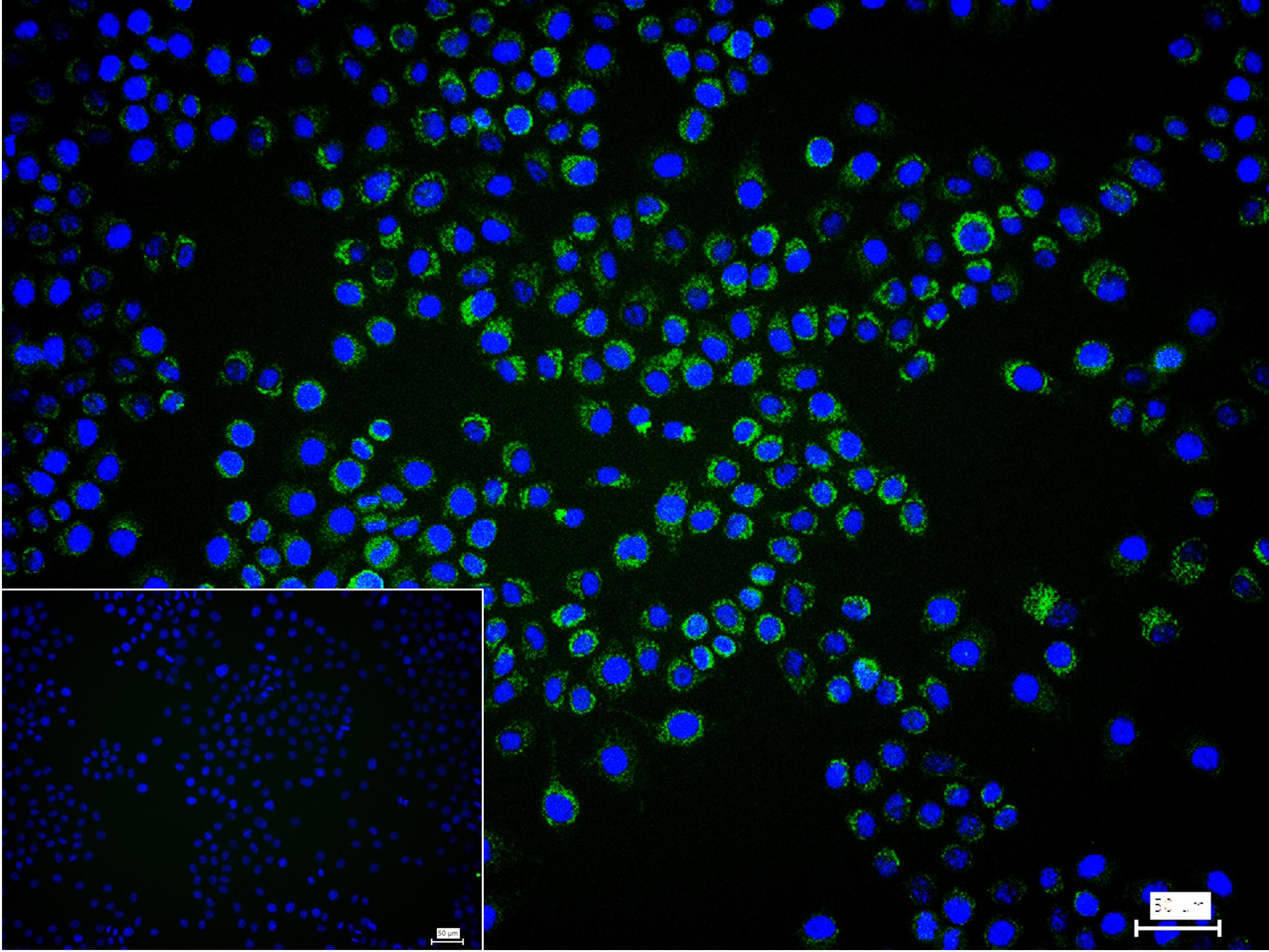 4% Paraformaldehyde-fixed Hela (H) cell; Triton X-100 at r.t. for 20 min; Antibody incubation with (ACADM) monoclonal Antibody, unconjugated (bsm-63329R) 1:100, 90 min at 37°C; followed by conjugated Goat Anti-Rabbit IgG antibody (green, bs-60295G-BF488) at 37°C for 90 min, DAPI (blue, C02-04002) was used to stain the cell nuclei. PBS instead of the primary antibody was used as the blank control.