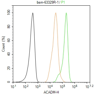 The Hela (H) cells were fixed with 4% PFA (10 min at r.t.) and then permeabilized with 90% ice-cold methanol for 20 min at -20℃,the cells then were incubated in 5%BSA to block non-specific protein-protein interactions (30 min at r.t.), followed by secondary antibody incubation for 40 min at room temperature. Primary Antibody (green):Rabbit Anti-ACADM antibody (bsm-63329R,1:100); Isotype Control (orange): Rabbit IgG (bs-0295P). Blank control (black): PBS. Acquisition of 20,000 events was performed.
