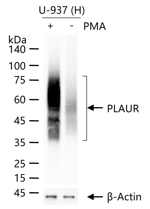 U-937 (H) cells were treated with or without PMA (200 nM) for 72 h, 25 μg total protein per lane of cell lysates (see on figure) probed with PLAUR monoclonal antibody, unconjugated (bsm-55595R) at 1:1000 dilution and 4°C overnight incubation. Followed by conjugated secondary antibody incubation at r.t. for 60 min.
