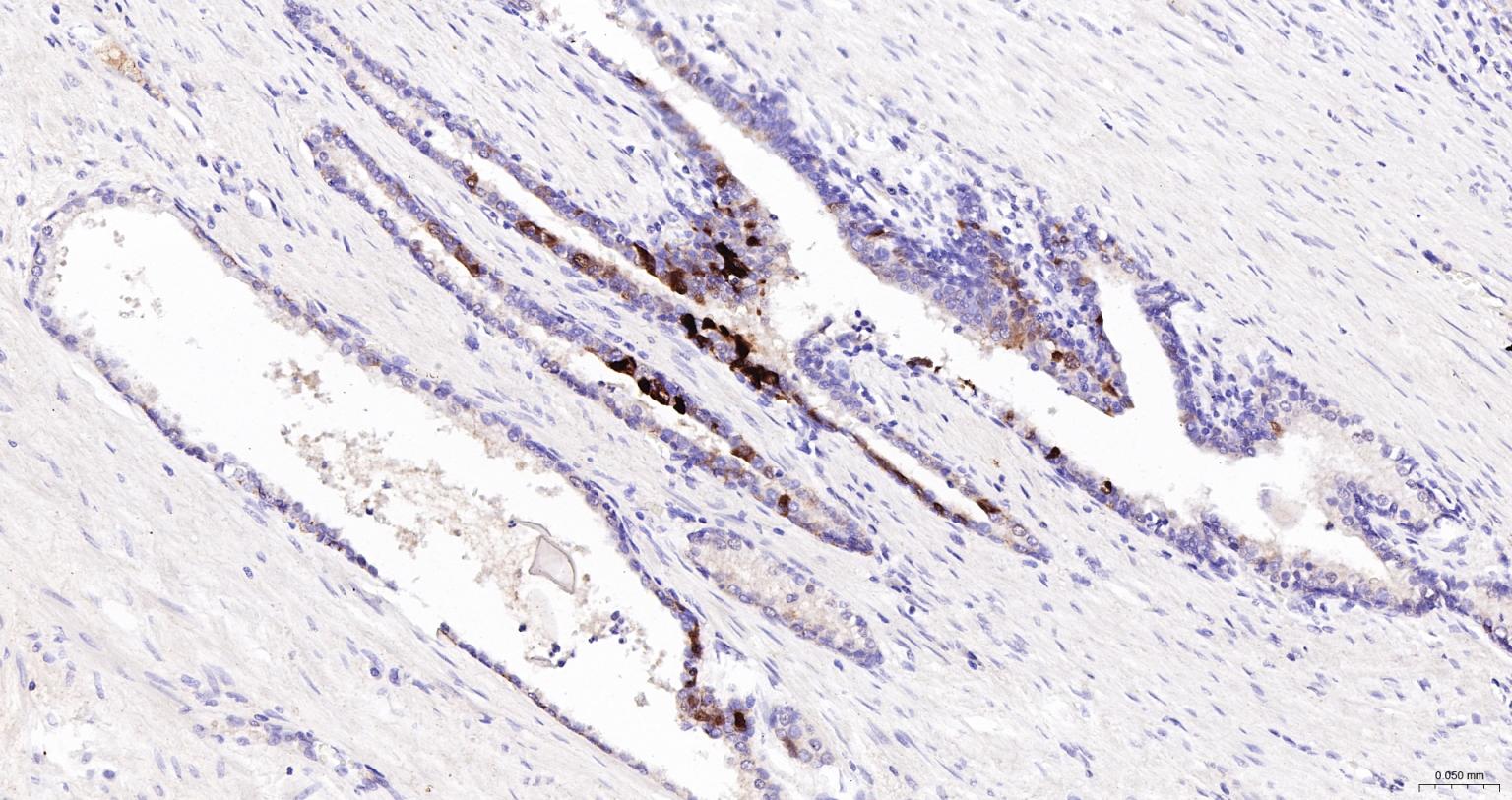 Paraformaldehyde-fixed, paraffin embedded Human Prostate; Antigen retrieval by boiling in sodium citrate buffer (pH6.0) for 15 min; The section was incubated with SERPINB3 Monoclonal Antibody, Unconjugated (bsm-43190R) at 1:200 overnight at 4°C, followed by conjugation to the bs-0295G-HRP and DAB (C-0010) staining.