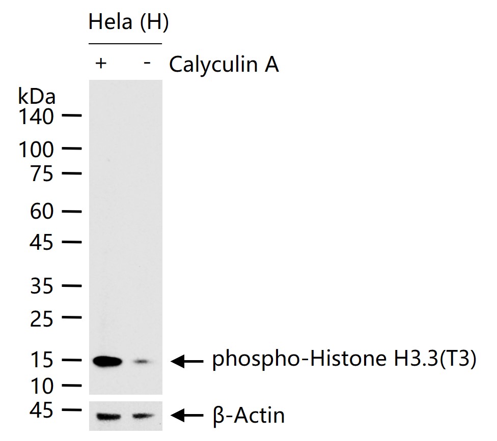 Hela (H) cells were treated with or without Calyculin A (100nM) for 30 min, 25 μg total protein per lane of cell lysates (see on figure) probed with phospho-Histone H3.3(T3) monoclonal antibody, unconjugated (bsm-63098R) at 1:1000 dilution and 4°C overnight incubation. Followed by conjugated secondary antibody incubation at r.t. for 60 min.