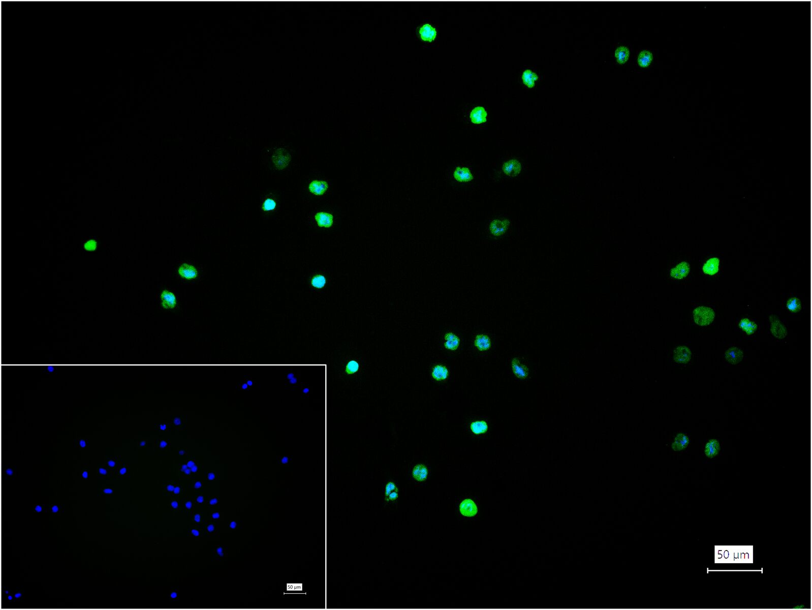 4% Paraformaldehyde-fixed HeLa (treated with 100ng/ml of nocodazole for 18 h) (H) cell; Triton X-100 at r.t. for 20 min; Antibody incubation with (phospho-Histone H3.3(S22)) monoclonal Antibody, unconjugated (bsm-63099R) 1:100, 90 min at 37°C; followed by BF488 conjugated Goat Anti-Rabbit IgG antibody (green, bs-60295G-BF488) at 37°C for 90 min, DAPI (blue, C02-04002) was used to stain the cell nuclei. PBS instead of the primary antibody was used as the blank control.