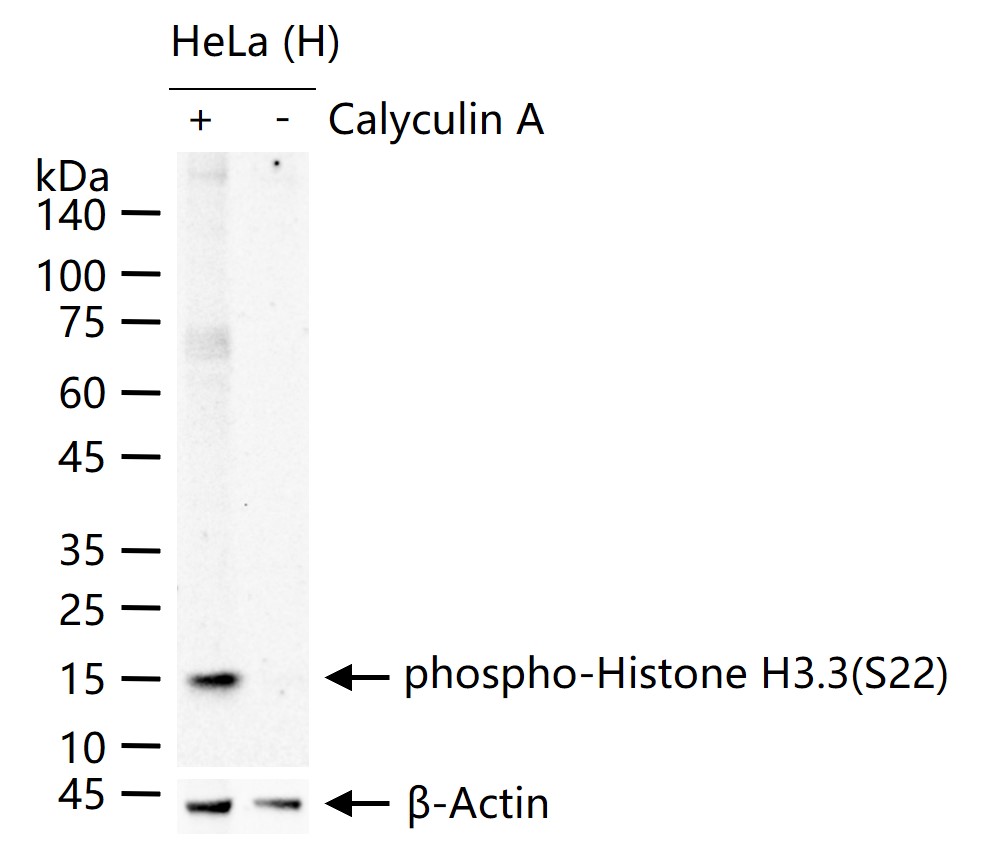 HeLa (H) cells were treated with or without Calyculin A (100nM) for 30 min, 25 μg total protein per lane of cell lysates (see on figure) probed with phospho-Histone H3.3(S22) monoclonal antibody, unconjugated (bsm-63099R) at 1:1000 dilution and 4°C overnight incubation. Followed by conjugated secondary antibody incubation at r.t. for 60 min.