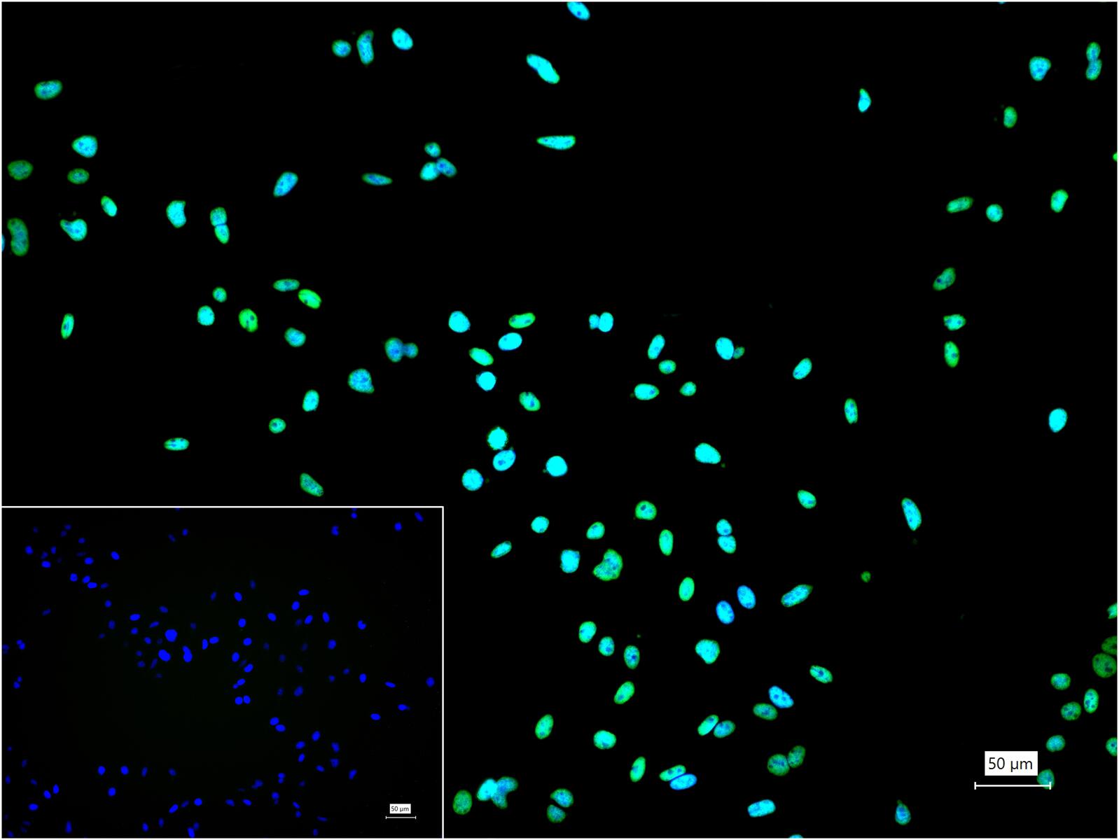 4% Paraformaldehyde-fixed HeLa (treated with Trichostatin A (TSA)(1μM,18h) ) (H) cell; Triton X-100 at r.t. for 20 min; Antibody incubation with (Di-Methyl-Histone H3 (K5)) monoclonal Antibody, unconjugated (bsm-63100R) 1:100, 90 min at 37°C; followed by BF488 conjugated Goat Anti-Rabbit IgG antibody (green, bs-60295G-BF488) at 37°C for 90 min, DAPI (blue, C02-04002) was used to stain the cell nuclei. PBS instead of the primary antibody was used as the blank control.
