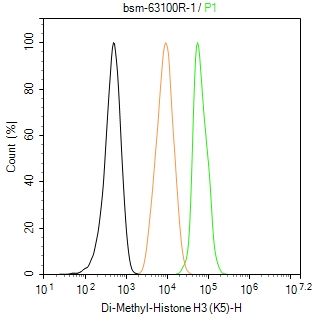 The HeLa (treated with Trichostatin A (TSA)(1μM, 18h)) (H) cells were fixed with 4% PFA (10 min at r.t.) and then permeabilized with 90% ice-cold methanol for 20 min at -20℃,the cells then were incubated in 5%BSA to block non-specific protein-protein interactions (30 min at r.t.), followed by secondary antibody incubation for 40 min at room temperature. Primary Antibody (green):Rabbit Anti-Di-Methyl-Histone H3 (K5) antibody (bsm-63100R,1:100); Isotype Control (orange): Rabbit IgG (bs-0295P). Blank control (black): PBS. Acquisition of 20,000 events was performed.