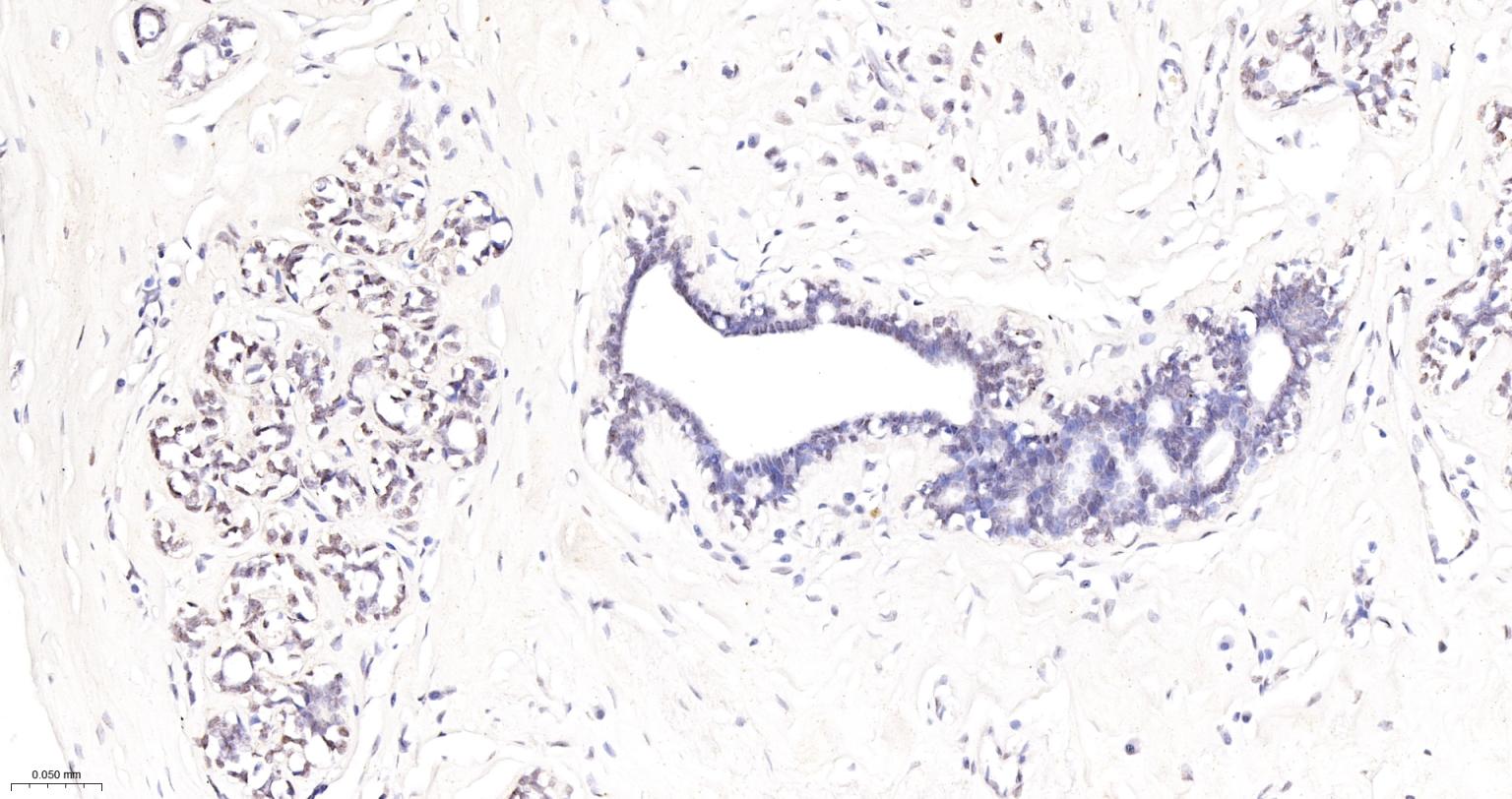 Paraformaldehyde-fixed, paraffin embedded Human Breast Cancer; Antigen retrieval by boiling in sodium citrate buffer (pH6.0) for 15 min; The section was incubated with phospho-DNA PKcs (S2056) Monoclonal Antibody, Unconjugated (bsm-63104R) at 1:200 overnight at 4°C, followed by conjugation to the bs-0295G-HRP and DAB (C-0010) staining.