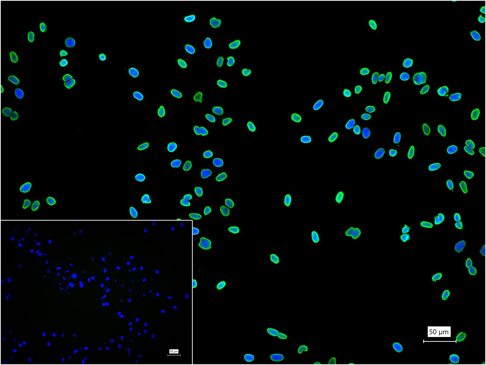 4% Paraformaldehyde-fixed HeLa (treated with Trichostatin A (TSA)(1μM, 18h)) (H) cell; Triton X-100 at r.t. for 20 min; Antibody incubation with (Acetyl-Histone H4 (K5)) monoclonal Antibody, unconjugated (bsm-63117R) 1:100, 90 min at 37°C; followed by BF488 conjugated Goat Anti-Rabbit IgG antibody (green, bs-60295G-BF488) at 37°C for 90 min, DAPI (blue, C02-04002) was used to stain the cell nuclei. PBS instead of the primary antibody was used as the blank control.