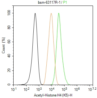 The HeLa (treated with Trichostatin A (TSA)(1μM, 18h)) (H) cells were fixed with 4% PFA (10 min at r.t.) and then permeabilized with 90% ice-cold methanol for 20 min at -20℃,the cells then were incubated in 5%BSA to block non-specific protein-protein interactions (30 min at r.t.), followed by secondary antibody incubation for 40 min at room temperature. Primary Antibody (green):Rabbit Anti-Acetyl-Histone H4 (K5) antibody (bsm-63117R,1:100); Isotype Control (orange): Rabbit IgG (bs-0295P). Blank control (black): PBS. Acquisition of 20,000 events was performed.