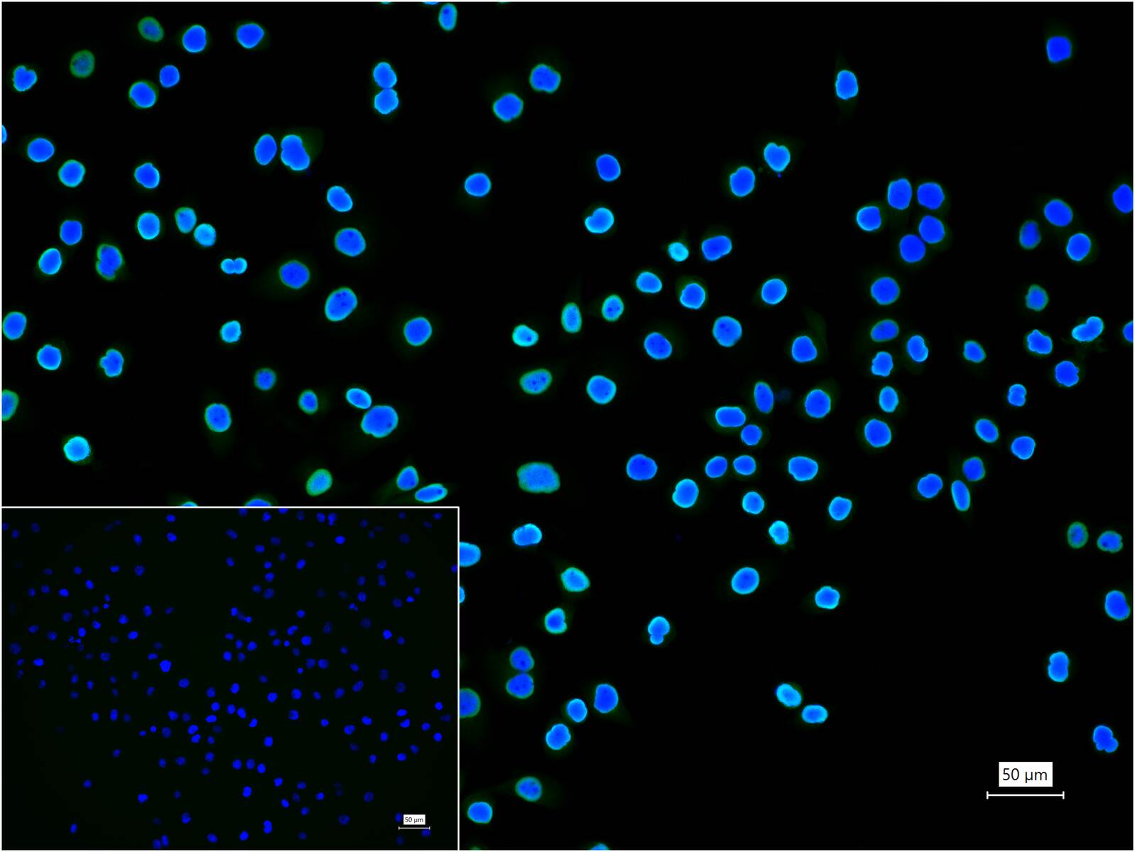 4% Paraformaldehyde-fixed HeLa (trichostatin A-treated (400nM for 24h), doxorubicin-treated (0.5µM for 24h)) (H) cell; Triton X-100 at r.t. for 20 min; Antibody incubation with (P53(Acetyl K370)) monoclonal Antibody, unconjugated (bsm-63129R) 1:100, 90 min at 37°C; followed by BF488 conjugated Goat Anti-Rabbit IgG antibody (green, bs-60295G-BF488) at 37°C for 90 min, DAPI (blue, C02-04002) was used to stain the cell nuclei. PBS instead of the primary antibody was used as the blank control.