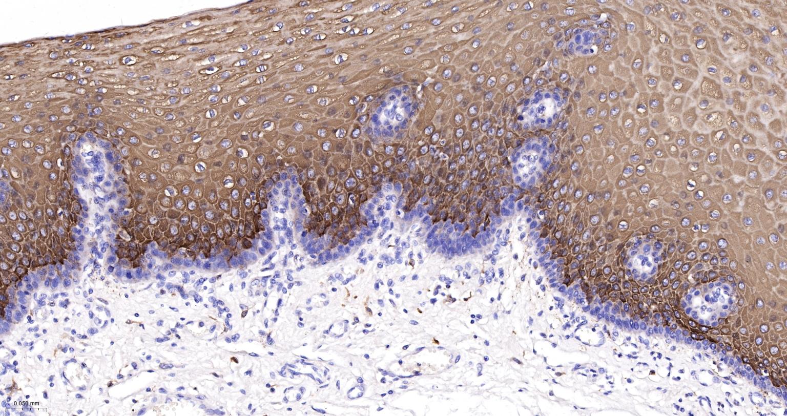 Paraformaldehyde-fixed, paraffin embedded Human Esophagus; Antigen retrieval by boiling in sodium citrate buffer (pH6.0) for 15 min; The section was incubated with Cytokeratin 6 Monoclonal Antibody, Unconjugated (bsm-63151R) at 1:200 overnight at 4°C, followed by conjugation to the bs-0295G-HRP and DAB (C-0010) staining.