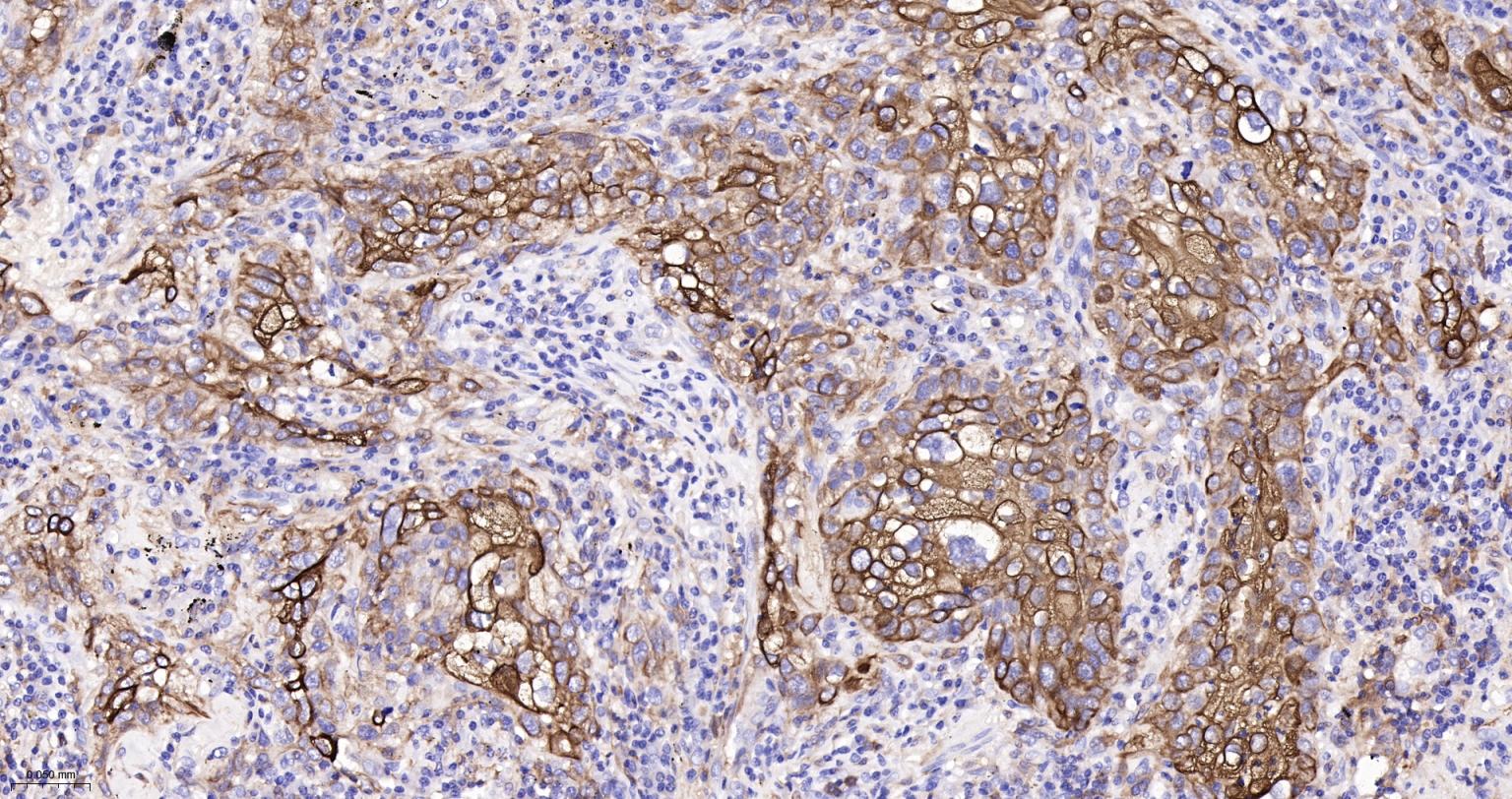 Paraformaldehyde-fixed, paraffin embedded Human lung squamous cell carcinoma; Antigen retrieval by boiling in sodium citrate buffer (pH6.0) for 15 min; The section was incubated with Cytokeratin 6 Monoclonal Antibody, Unconjugated (bsm-63151R) at 1:200 overnight at 4°C, followed by conjugation to the bs-0295G-HRP and DAB (C-0010) staining.