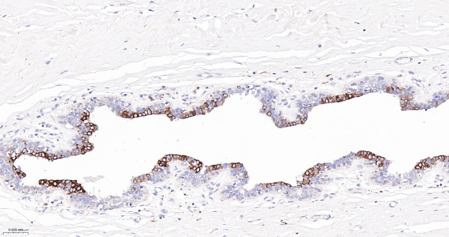 Paraformaldehyde-fixed, paraffin embedded Human Breast; Antigen retrieval by boiling in sodium citrate buffer (pH6.0) for 15 min; The section was incubated with Cytokeratin 6 Monoclonal Antibody, Unconjugated (bsm-63151R) at 1:200 overnight at 4°C, followed by conjugation to the bs-0295G-HRP and DAB (C-0010) staining.
