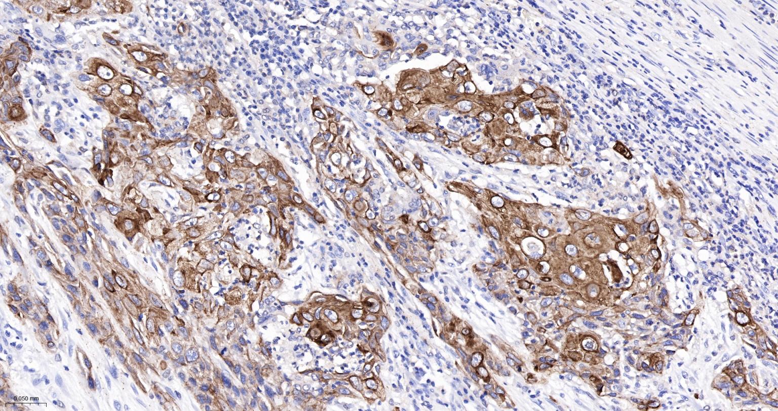 Paraformaldehyde-fixed, paraffin embedded Human Cervical Cancer; Antigen retrieval by boiling in sodium citrate buffer (pH6.0) for 15 min; The section was incubated with Cytokeratin 6 Monoclonal Antibody, Unconjugated (bsm-63151R) at 1:200 overnight at 4°C, followed by conjugation to the bs-0295G-HRP and DAB (C-0010) staining.