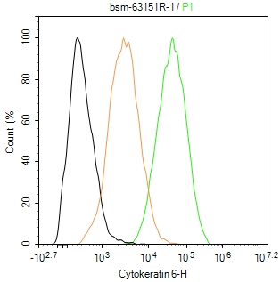 The HaCaT(H) cells were fixed with 4% PFA (10 min at r.t.) and then permeabilized with 90% ice-cold methanol for 20 min at -20℃,the cells then were incubated in 5%BSA to block non-specific protein-protein interactions (30 min at r.t.), followed by secondary antibody incubation for 40 min at room temperature. Primary Antibody (green):Rabbit Anti-Cytokeratin 6 antibody (bsm-63151R,1:100); Isotype Control (orange): Rabbit IgG (bs-0295P). Blank control (black): PBS. Acquisition of 20,000 events was performed.