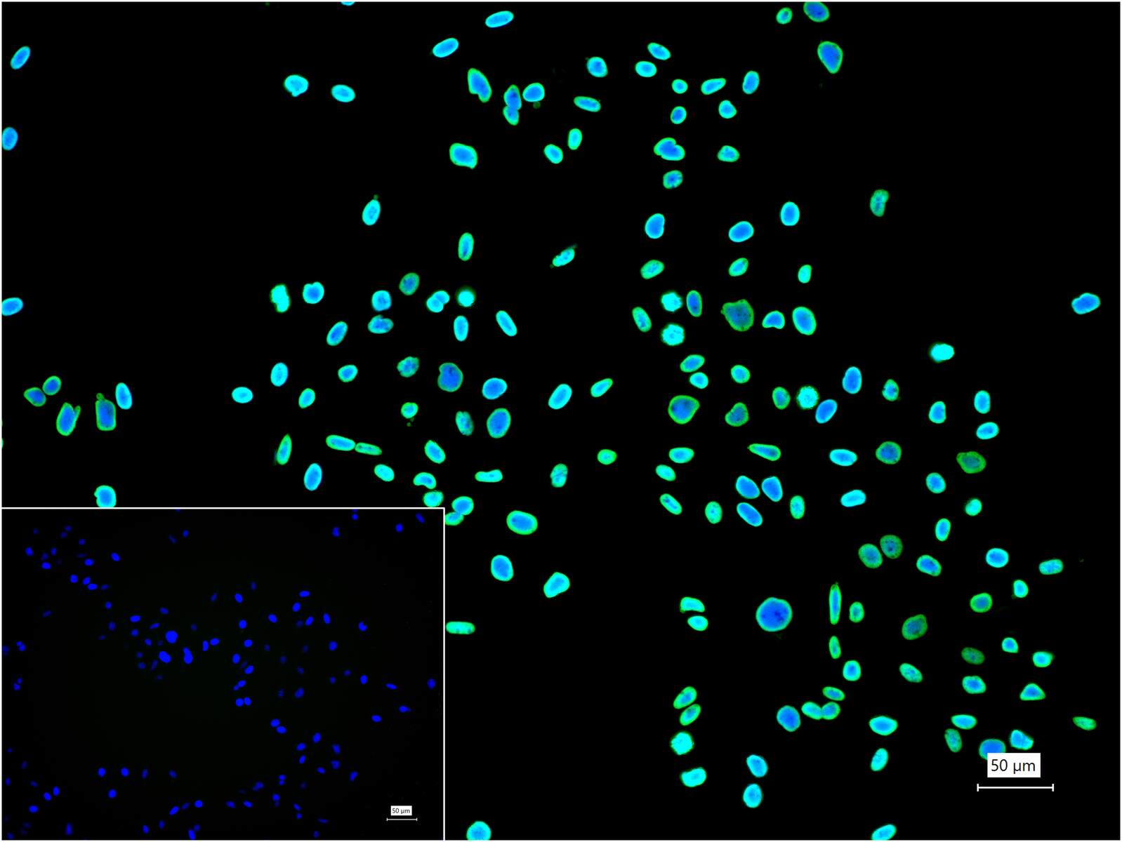 4% Paraformaldehyde-fixed HeLa (treated with Trichostatin A (TSA)(1μM, 18h)) (H) cell; Triton X-100 at r.t. for 20 min; Antibody incubation with (Histone H2B (Acetyl K20)) monoclonal Antibody, unconjugated (bsm-63153R) 1:100, 90 min at 37°C; followed by BF488 conjugated Goat Anti-Rabbit IgG antibody (green, bs-60295G-BF488) at 37°C for 90 min, DAPI (blue, C02-04002) was used to stain the cell nuclei. PBS instead of the primary antibody was used as the blank control.