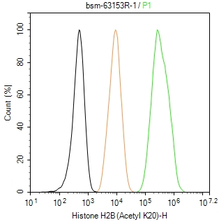 The HeLa (treated with Trichostatin A (TSA)(1μM, 18h)) (H) cells were fixed with 4% PFA (10 min at r.t.) and then permeabilized with 90% ice-cold methanol for 20 min at -20℃,the cells then were incubated in 5%BSA to block non-specific protein-protein interactions (30 min at r.t.), followed by secondary antibody incubation for 40 min at room temperature. Primary Antibody (green):Rabbit Anti-Histone H2B (Acetyl K20) antibody (bsm-63153,1:100); Isotype Control (orange): Rabbit IgG (bs-0295P). Blank control (black): PBS. Acquisition of 20,000 events was performed.