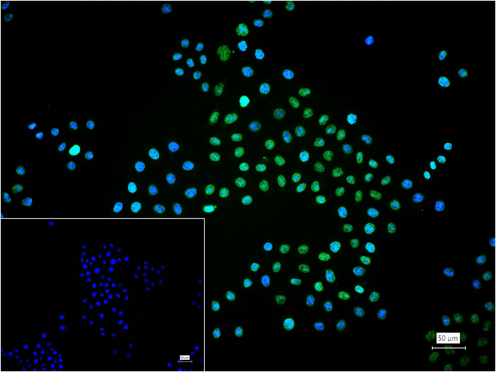 4% Paraformaldehyde-fixed HeLa (H) cell; Triton X-100 at r.t. for 20 min; Antibody incubation with (Di-Methyl-Histone H3 (K9)) monoclonal Antibody, unconjugated (bsm-63154R) 1:100, 90 min at 37°C; followed by BF488 conjugated Goat Anti-Rabbit IgG antibody (green, bs-60295G-BF488) at 37°C for 90 min, DAPI (blue, C02-04002) was used to stain the cell nuclei. PBS instead of the primary antibody was used as the blank control.