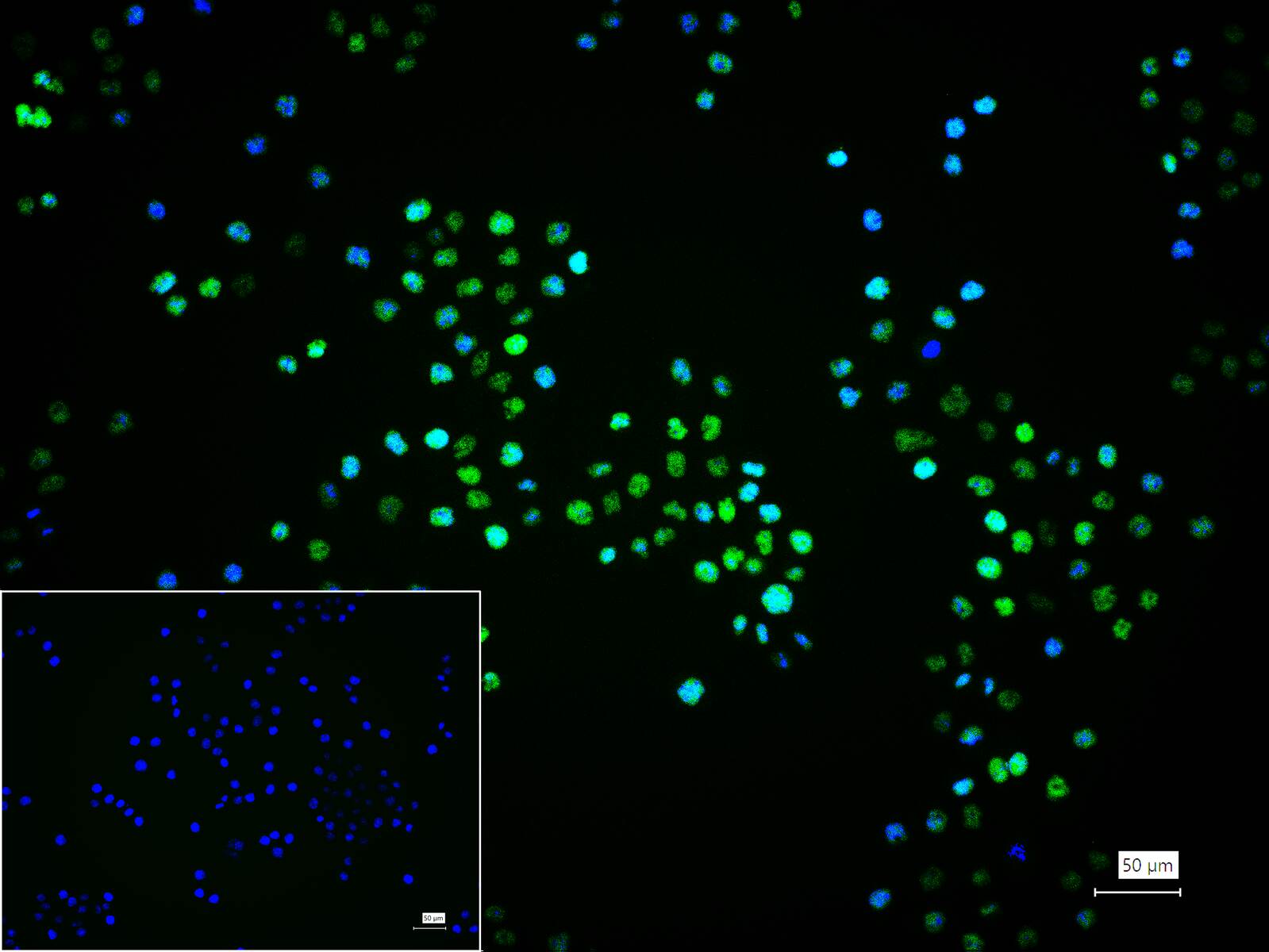 4% Paraformaldehyde-fixed HeLa (H) cell; Triton X-100 at r.t. for 20 min; Antibody incubation with (JunD) monoclonal Antibody, unconjugated (bsm-63182R) 1:100, 90 min at 37°C; followed by BF488 conjugated Goat Anti-Rabbit IgG antibody (green, bs-60295G-BF488) at 37°C for 90 min, DAPI (blue, C02-04002) was used to stain the cell nuclei. PBS instead of the primary antibody was used as the blank control.