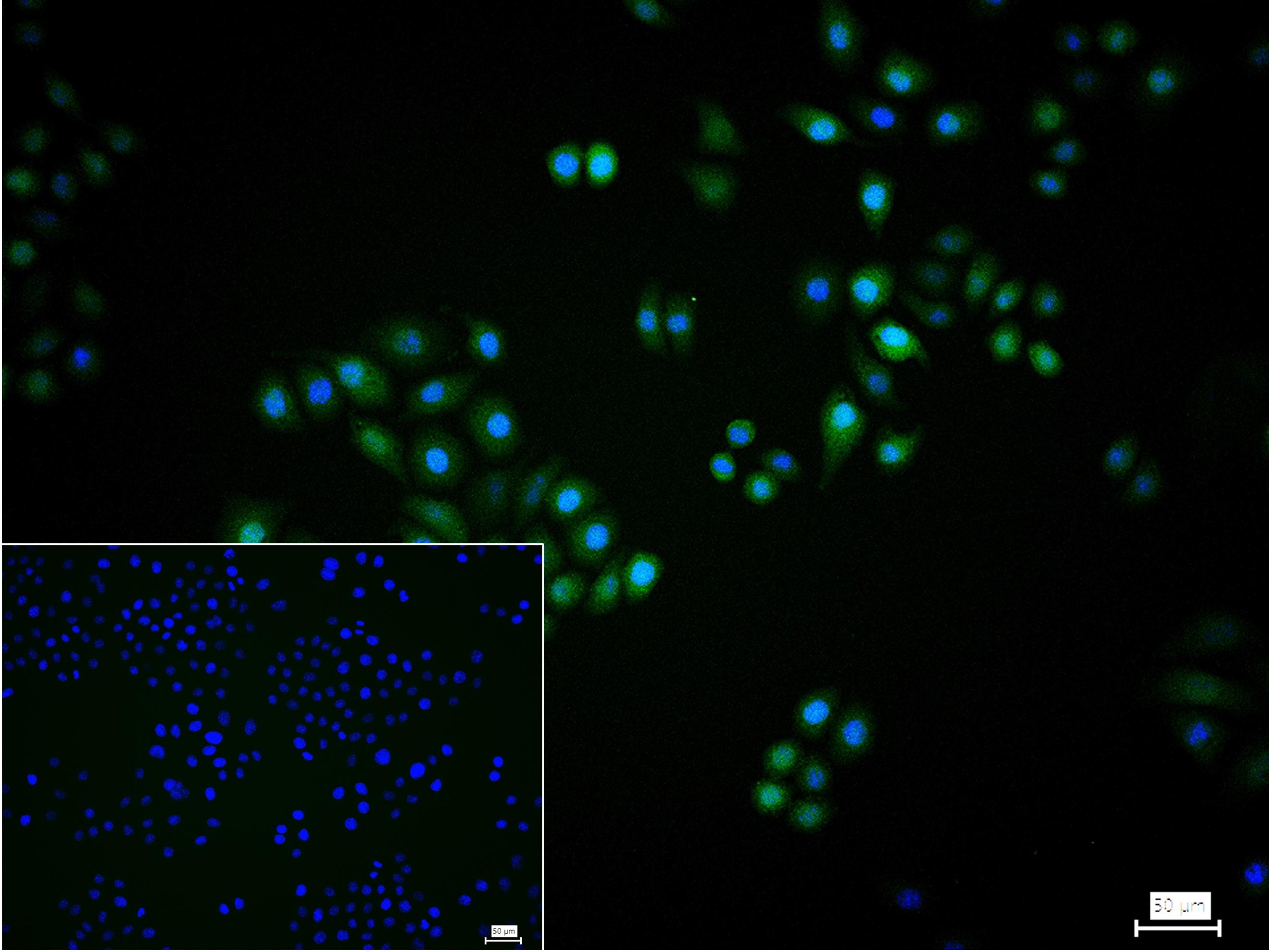 4% Paraformaldehyde-fixed Hela (H) cell; Triton X-100 at r.t. for 20 min; Antibody incubation with (4E-BP1) monoclonal Antibody, unconjugated (bsm-63191R) 1:100, 90 min at 37°C; followed by conjugated Goat Anti-Rabbit IgG antibody (green, bs-60295G-BF488) at 37°C for 90 min, DAPI (blue, C02-04002) was used to stain the cell nuclei. PBS instead of the primary antibody was used as the blank control.