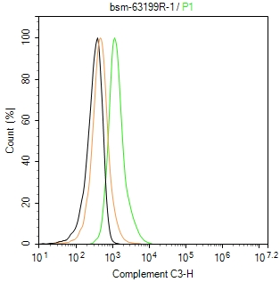 The HepG2 (H) cells were fixed with 4% PFA (10 min at r.t.) and then permeabilized with 90% ice-cold methanol for 20 min at -20℃,the cells then were incubated in 5%BSA to block non-specific protein-protein interactions (30 min at r.t.), followed by secondary antibody incubation for 40 min at room temperature. Primary Antibody (green):Rabbit Anti-Complement C3 antibody (bsm-63199R,1:100); Isotype Control (orange): Rabbit IgG (bs-0295P). Blank control (black): PBS. Acquisition of 20,000 events was performed.