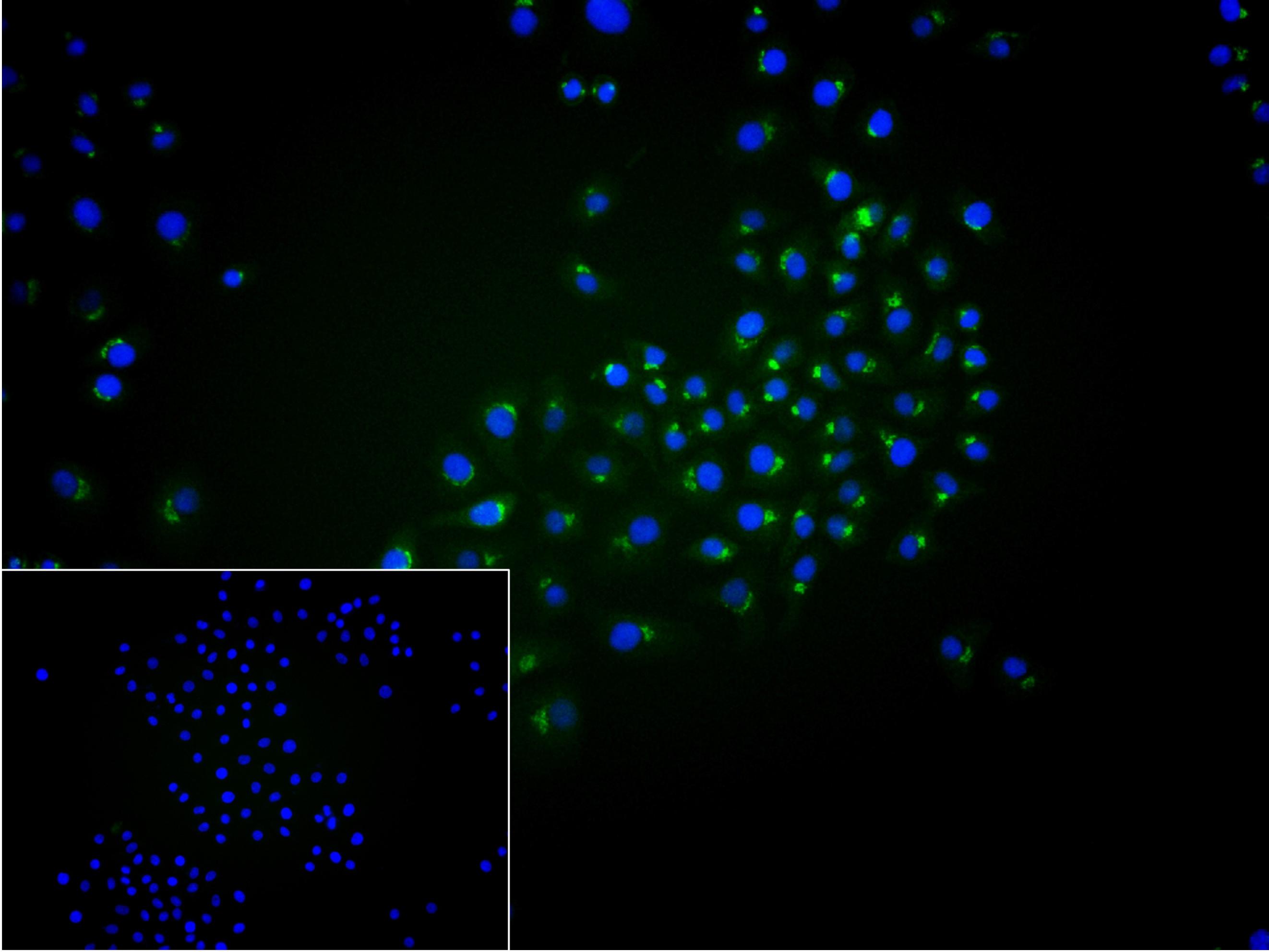 4% Paraformaldehyde-fixed HepG2 (H) cell; Triton X-100 at r.t. for 20 min; Antibody incubation with (Complement C3) monoclonal Antibody, unconjugated (bsm-63199R) 1:100, 90 min at 37°C; followed by conjugated Goat Anti-Rabbit IgG antibody (green, bs-60295G-BF488) at 37°C for 90 min, DAPI (blue, C02-04002) was used to stain the cell nuclei. PBS instead of the primary antibody was used as the blank control.